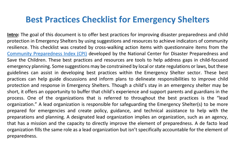 The goal of this tool is to offer best practices for improving preparedness and child-protection in Emergency Shelters by using suggestions and resources to strengthen community resilience. This checklist was c...