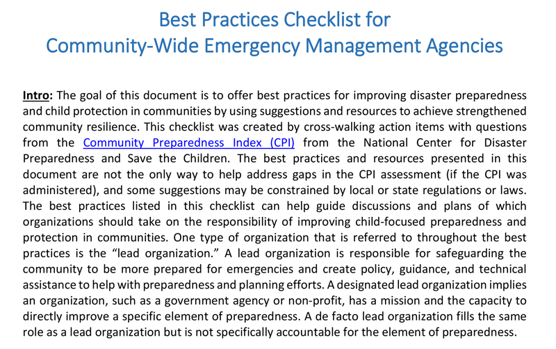 The goal of this tool is to offer best practices for improving preparedness and child-protection in Community-wide Emergency Management organizations by using suggestions and resources to strengthen community r...